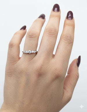 La disposizione delle pietre — ordinate in una sequenza crescente verso il centro — crea un effetto sofisticato e armonioso, ideale per chi ama i dettagli preziosi e discreti. Perfetto da indossare ogni giorno o come anello da stacking, aggiunge un tocco di brillantezza a qualsiasi look.