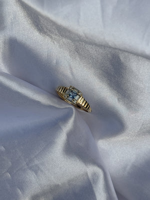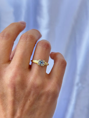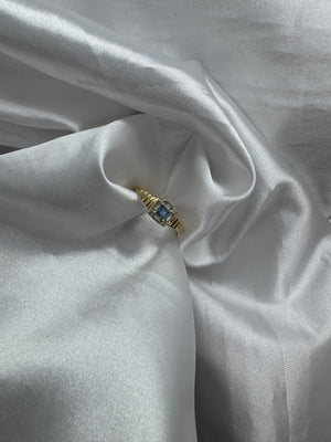 Anello in argento 925 placcato oro, impreziosito da una pietra celeste taglio smeraldo che cattura la luce con delicatezza. Il design elegante e contemporaneo si unisce alla praticità di una fascia regolabile, che consente di adattarlo perfettamente a qualsiasi misura. Un gioiello raffinato, ideale per aggiungere un tocco di colore e femminilità a ogni look.