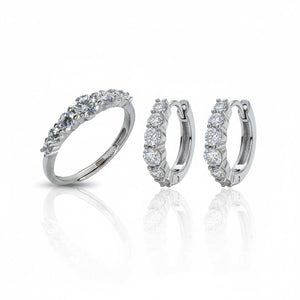 Gli orecchini a cerchio presentano una silhouette delicata ma scintillante, perfetta per aggiungere luce al viso. L’anello abbinato riprende lo stesso design, con una fila armoniosa di pietre che esaltano la mano con classe e semplicità.