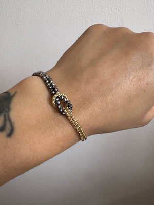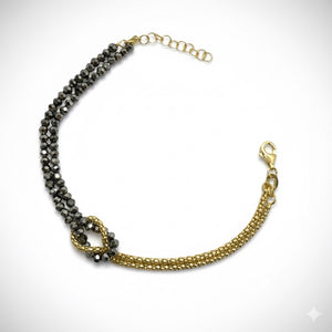 Bracciale in argento 925 dorato arricchito da fili di ematite sfaccettati che si incontrano in un raffinato nodo. Un gioiello elegante e luminoso, perfetto per serate, eventi o per dare un tocco di classe a qualsiasi outfit.