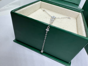 La catena sottile sostiene una sequenza di zirconi taglio brillante, disposti in ordine decrescente fino a formare un pendente lungo e delicato che slancia la figura e cattura la luce a ogni movimento.