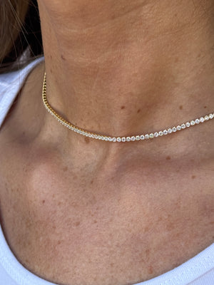 La sua linea continua di pietre riflette la luce in modo armonioso, esaltando il décolleté con un tocco di raffinatezza naturale.
