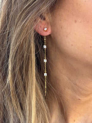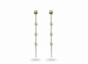 Eleganti orecchini in argento 925 con finitura dorata, caratterizzati da una catena sottile impreziosita da zirconi bianchi luminosi. Il design raffinato e leggero valorizza il viso con una luce delicata, perfetto per aggiungere un tocco di eleganza ad ogni look.