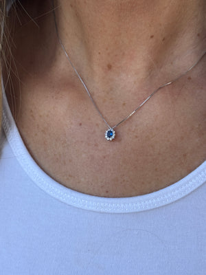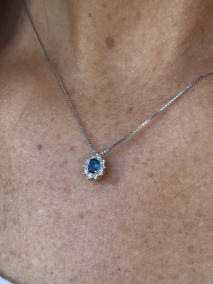 La pietra blu zaffiro sintetico, taglio ovale, è impreziosita da una corona di zirconi bianchi che riflettono la luce con eleganza.