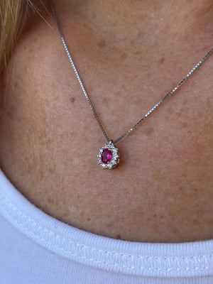 Il pendente in argento 925 rodiato presenta una pietra ovale rossa incorniciata da zirconi bianchi che ne esaltano la lucentezza e la profondità.