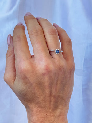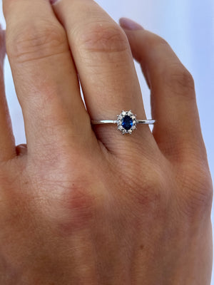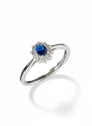Realizzato in argento 925 rodiato, presenta una pietra blu taglio ovale incastonata al centro, circondata da una luminosa corona di zirconi bianchi che amplificano la brillantezza e il fascino regale del colore.