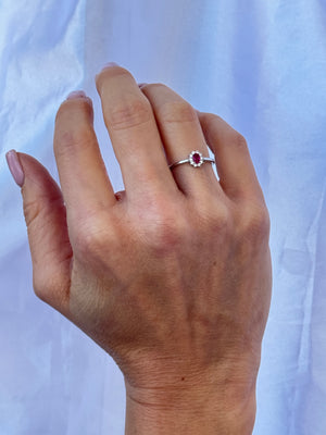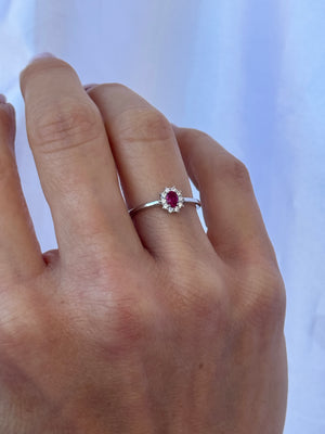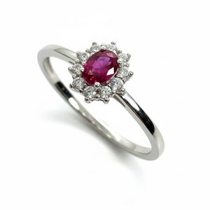 Realizzato in argento 925 rodiato, è impreziosito da una pietra ovale rossa, avvolta da una scintillante corona di zirconi bianchi che ne valorizzano il colore caldo e vibrante.