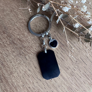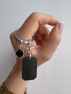 Portachiavi realizzato interamene in argento 925 con ciondolino multimediale con possibilità di incisione nel retro.