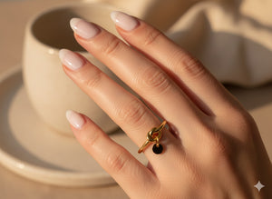 Anello elegante in argento 925 con finitura dorata, caratterizzato da un raffinato doppio anello intrecciato da cui pende un piccolo charm rotondo. Il cerchietto è pensato per essere inciso, rendendo il gioiello completamente personalizzabile: una lettera, un’iniziale, una data o un simbolo che rappresenti un legame speciale.