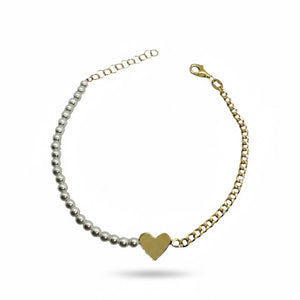Elegante bracciale in argento 925 con placcatura oro, caratterizzato da un raffinato design asimmetrico: da un lato una fila di perle sintetiche luminose, dall’altro una catena dorata a maglia fine. Al centro spicca un delicato cuore dorato, simbolo di dolcezza ed equilibrio tra stile classico e moderno.