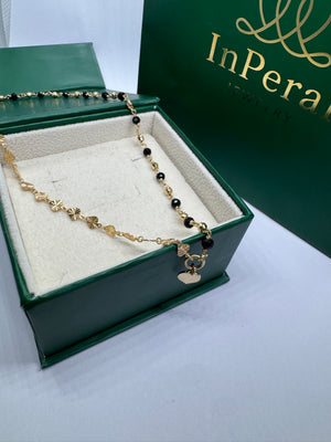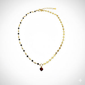 Elegante collana in argento 925 con placcatura in oro, caratterizzata da una raffinata alternanza di micro elementi decorativi geometrici e cristalli sfaccettati neri che donano profondità e contrasto. Al centro risplende un ciondolo a forma di cuore, minimal e luminoso, perfetto per aggiungere un tocco romantico e sofisticato a qualsiasi look.