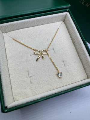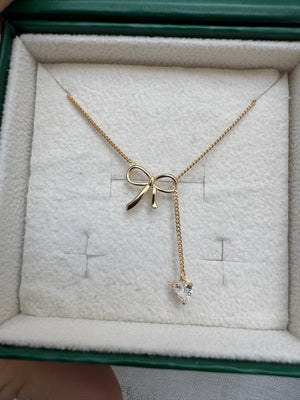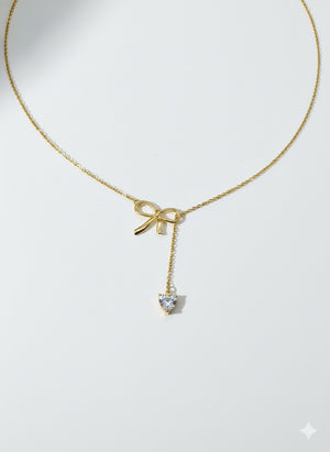 Delicata collana in argento 925 con placcatura oro, caratterizzata da un elegante fiocco minimal che dona un tocco romantico e femminile. Dal fiocco scende una sottile catenina che termina con un luminoso ciondolo a cuore in cristallo trasparente, pensato per catturare la luce a ogni movimento.