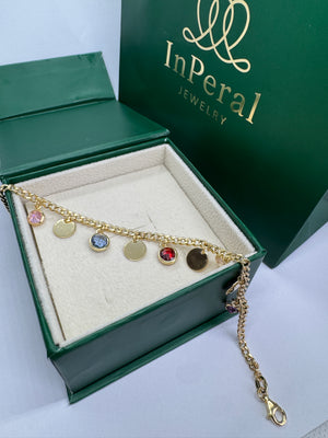 • Charm: dischetti dorati lucidati a specchio + cristalli colorati sfaccettati