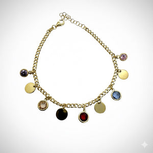 Realizzato in argento 925 placcato oro, questo gioiello presenta una catena a maglia fine da cui pendono diversi charm: piccoli dischetti dorati lucidi e cristalli colorati taglio sfaccettato, che catturano la luce a ogni movimento.